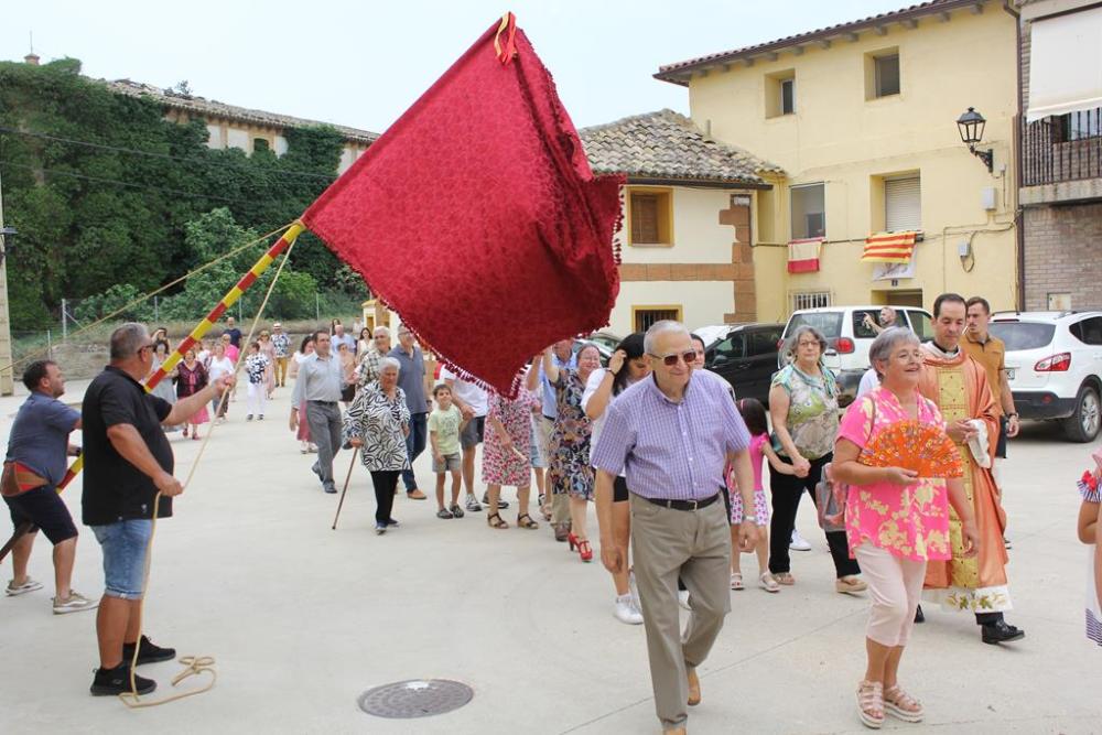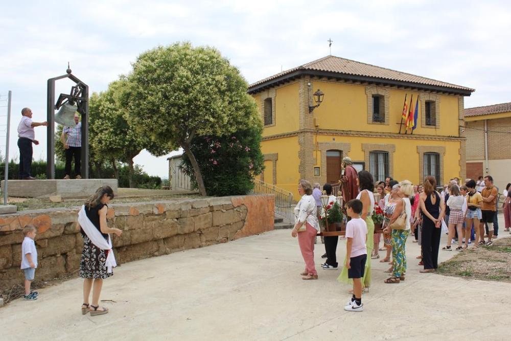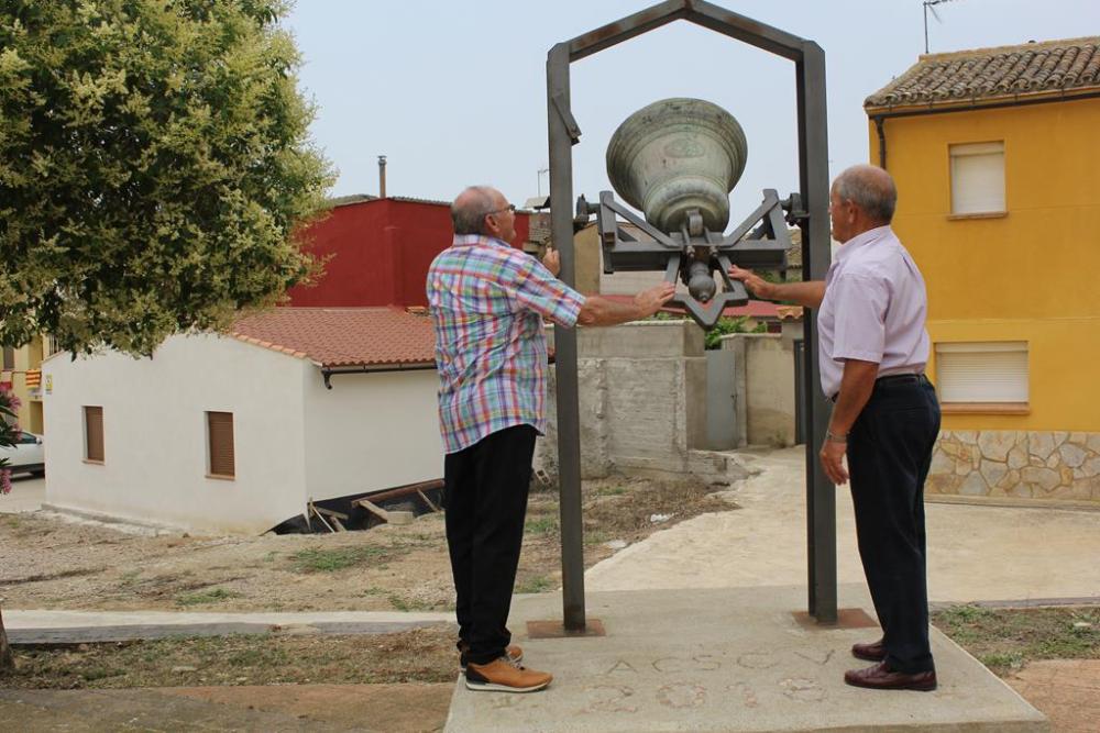 Al llegar a la plaza de la iglesia, la peana ha sido colocada frente a la campana, volteada por otro dos vecinos, Ángel Domper y Ángel Sarvisé. La campana es uno de los pocos elementos que pudo recuperarse tras el derrumbe de la torre de la iglesia, que tuvo lugar en 2017, sin ocasionar daños personales.